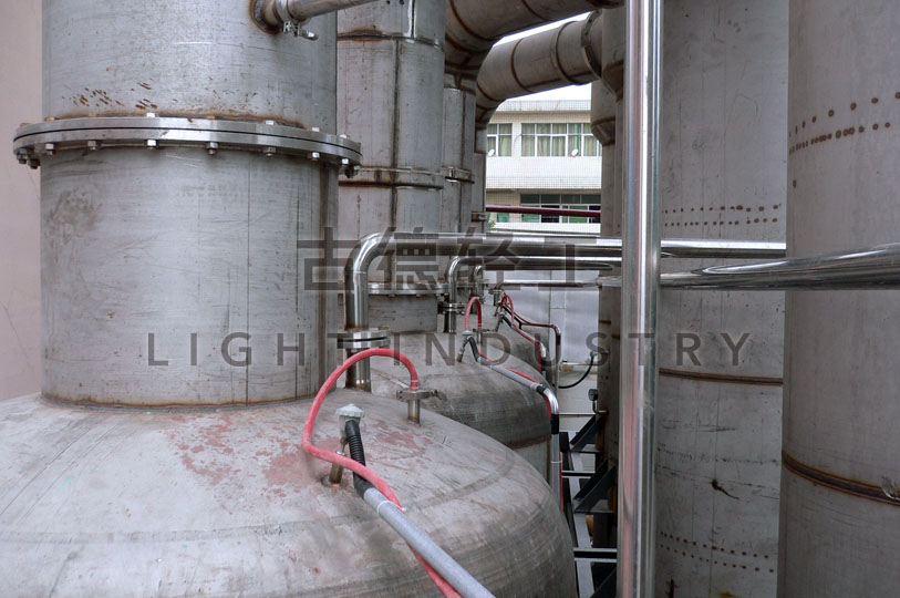 此套四效降膜蒸發器由一(yī)、二、三、四效蒸發器,一、二、三、四效分離器、閃蒸器、物料泵、平衡槽、電控箱、工作台及所有管路、閥門組成。並且為了(le)能夠使料液(yè)均勻分布在各加熱管,沿管內壁流下,所以在(zài)管(guǎn)的頂部(bù)或管內(nèi)安裝(zhuāng)降膜分布器,分配板,它為一個多孔板,其孔的位置,正好交錯於加熱器列管之間。